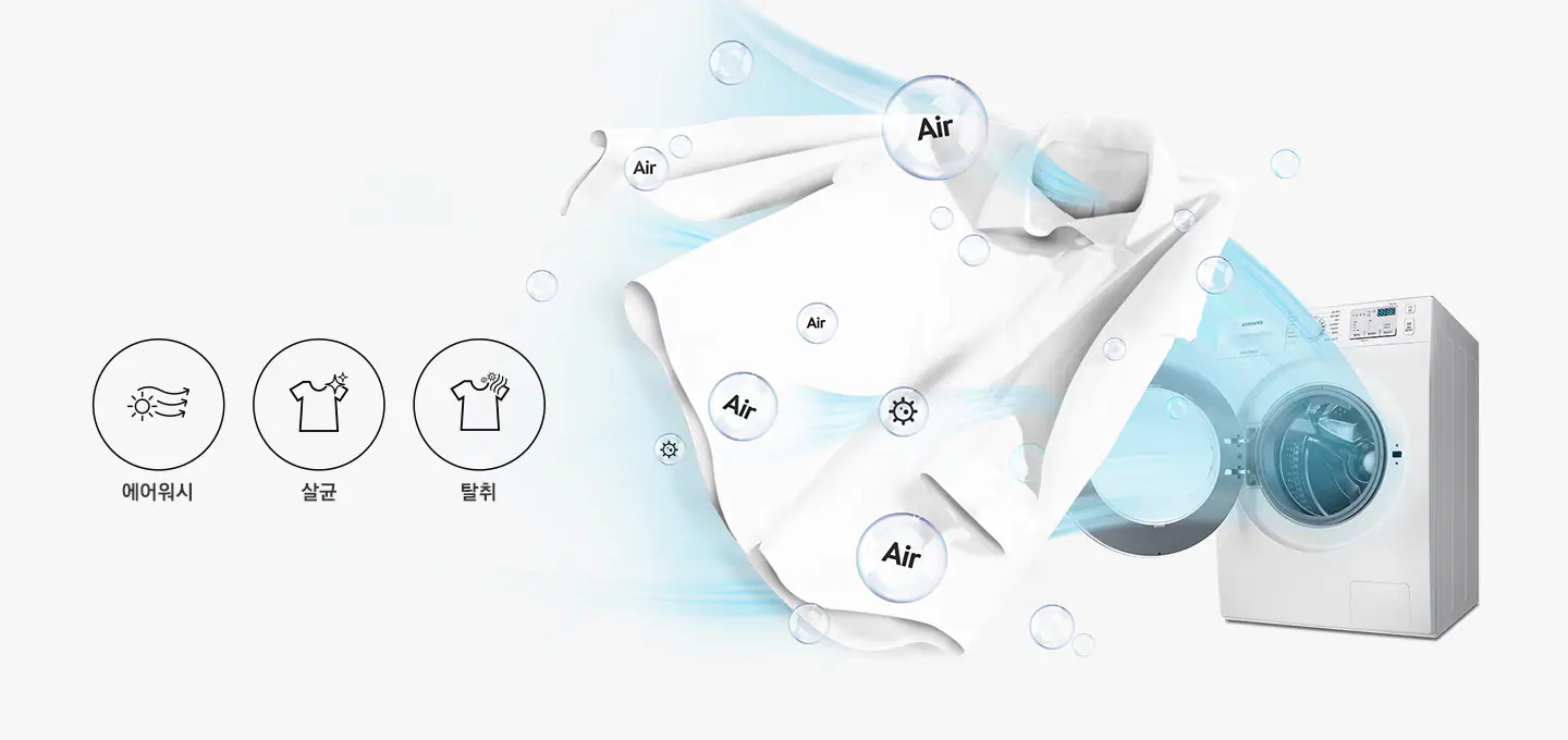 | 주요기능 | 스마트체크 없음 건조 추가 있음 | 물온도 있음 버튼 잠금 있음 | 헹금 횟수 있음 세탁코스 표준, 절약, 찌든때, 아기옷, 건조단독, 에어살균/탈취, 소량/쾌속, 헹굼+탈수, 탈수, 울/란제리, 아웃도어, 통세척 |