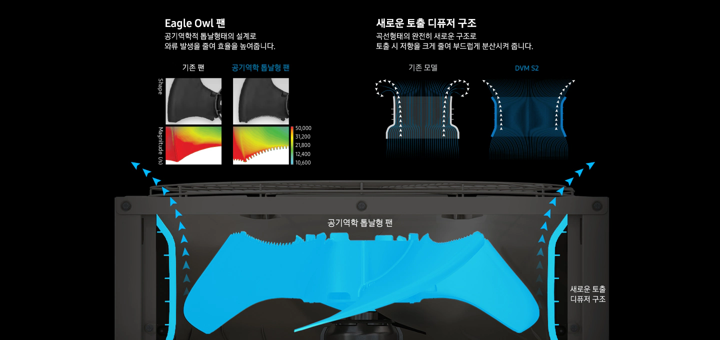 새롭게 적용된 수리부엉이 날개 형상을 닮은 톱날형 팬은 와류는 줄이고, 풍량은 증대시켜 효율을 극대화합니다.