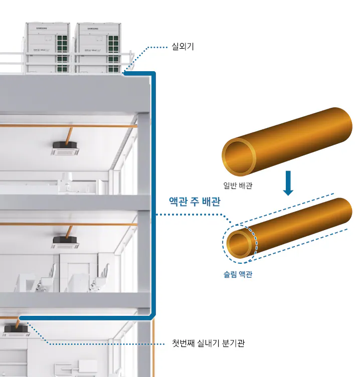 * 사내 실험 기준 AM080AXVGGH/EU 실외기와 AM083NN4DBH1, AM145NN4DBH1 실내기 25 m 배관 연결 기준