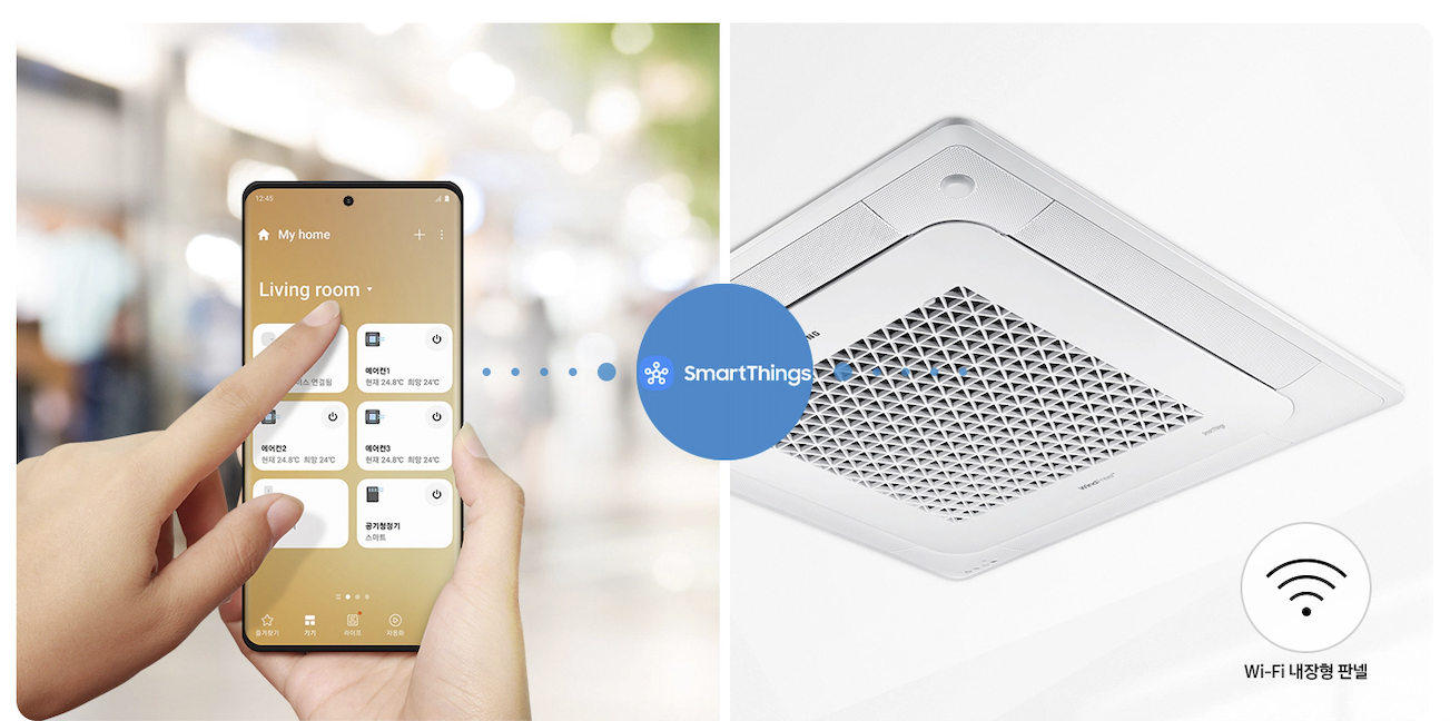 실내기 판넬에 Wi-Fi가 설치되어 SmartThings 앱을 통해 어디서나 쉽고 간편하게 제어할 수 있습니다.