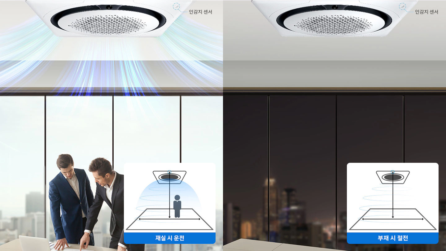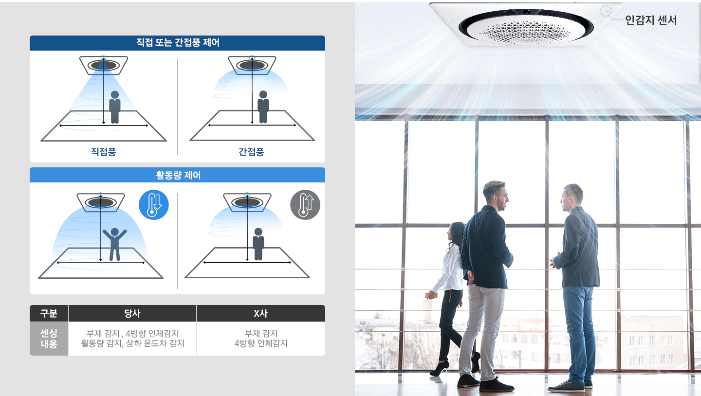 인감지 센서로 위치에 따라 바람각도를 조절하는 직접풍/간접풍 운전, 활동량에 따른 쾌적제어,