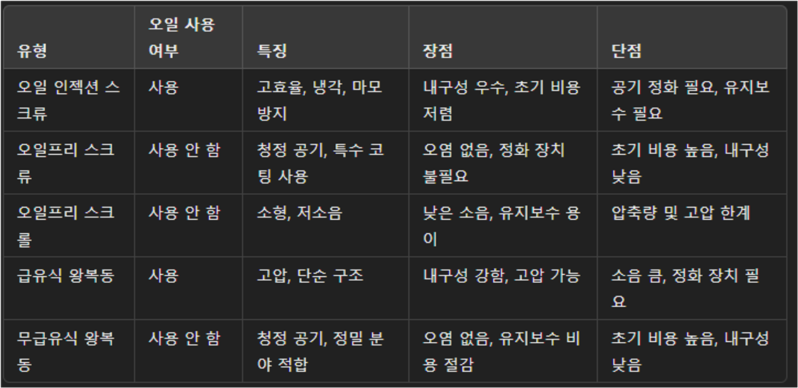 압축 공정 중 윤활유(오일)가 나사식 회전자(스크류)에 주입되어 윤활, 냉각, 그리고 밀봉 역할을 수행함.